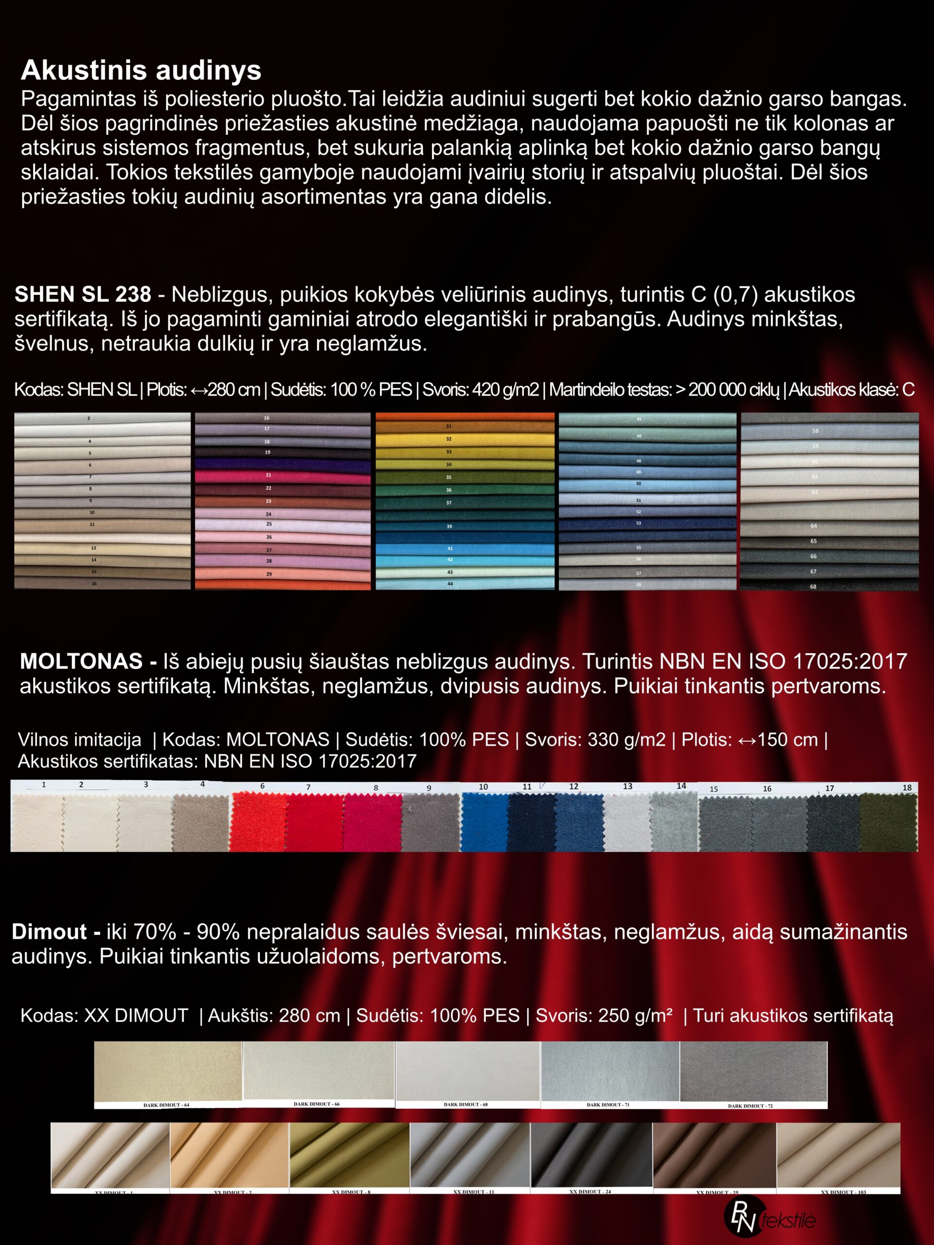 For more information and FR fabric orders please contact: marketing@bntekstile.store Light proof fabric (absorbs 80% of sunlight) Acoustic certificate Possible in FR (with certificate) Code: DARK DIMOUT Width: 300 cm Composition: 100% PES Weight: 210 g/m²