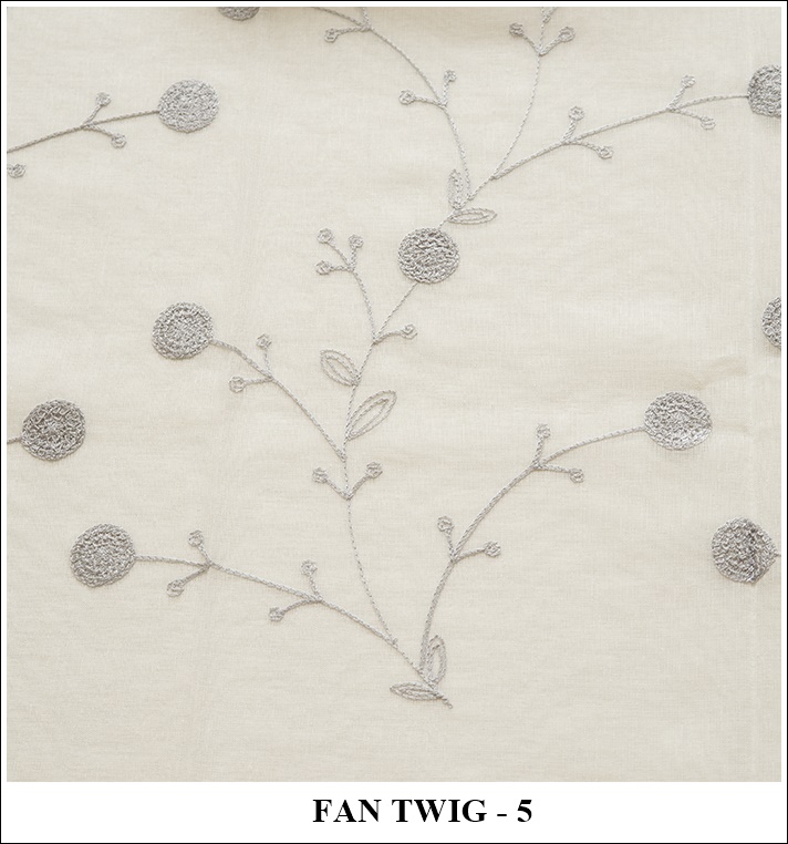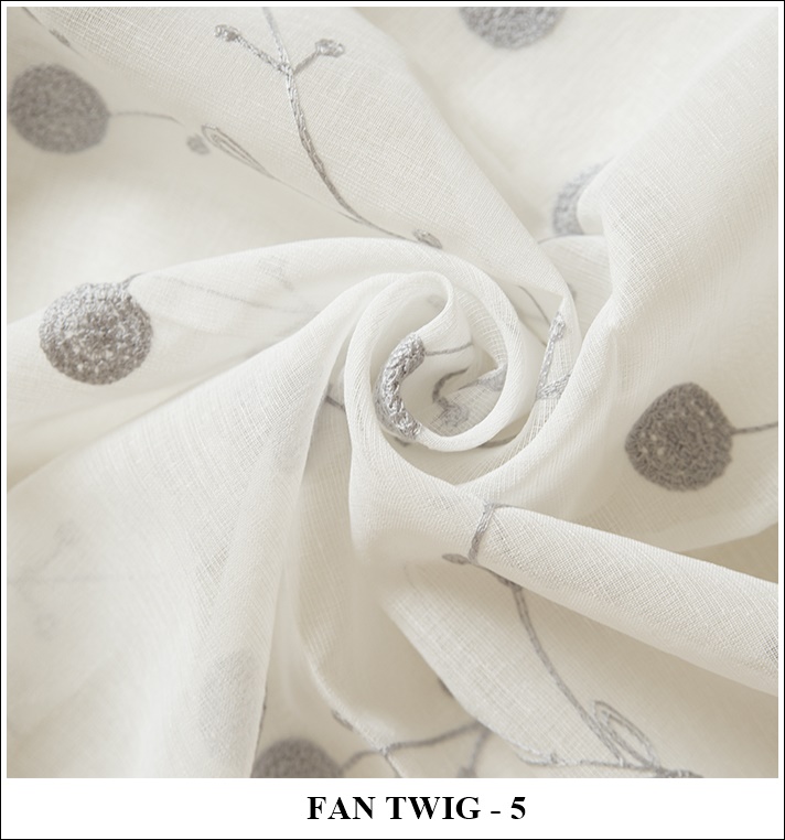 Code: FAN TWIG Height: ↕295 cmReviews Composition: 100% PES Weight: 380 g/m Pattern: ↕47,1 cm ↔29,7 cm Embroidery is arranged over the overall height of the fabric: 12 cm. no embroidery on the bottom of the fabric from the lead strip; 262 cm. embroidered; 21 cm. no embroidery at the top.
