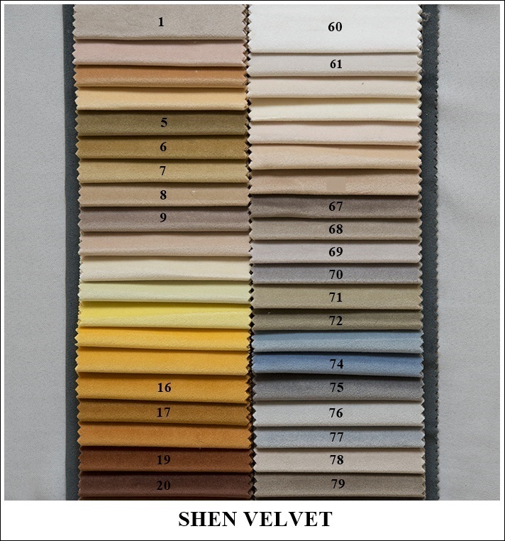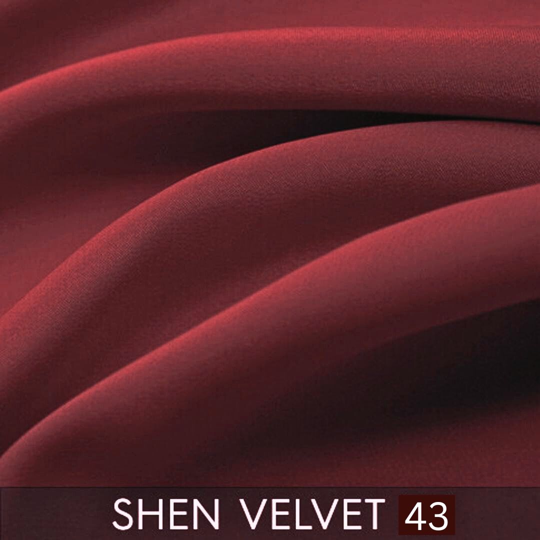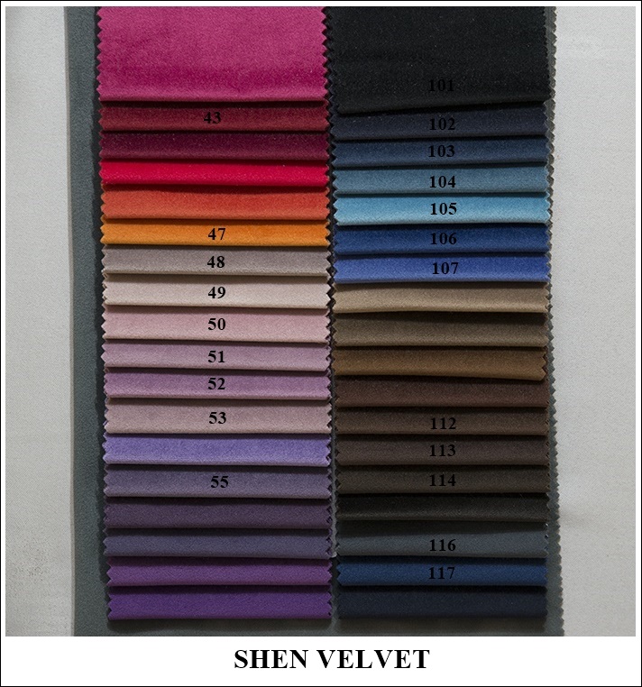 Code: SHEN VELVET Width: ↔140 cm Composition: 100 % PES; Weight: 450 g/m Martindale test:120 000 cycles Velvet, velours.