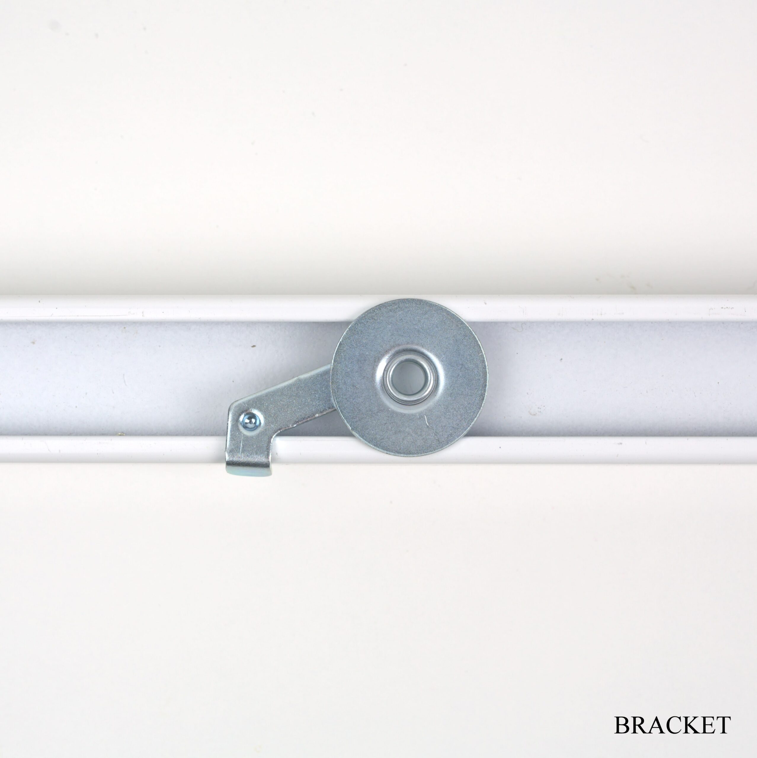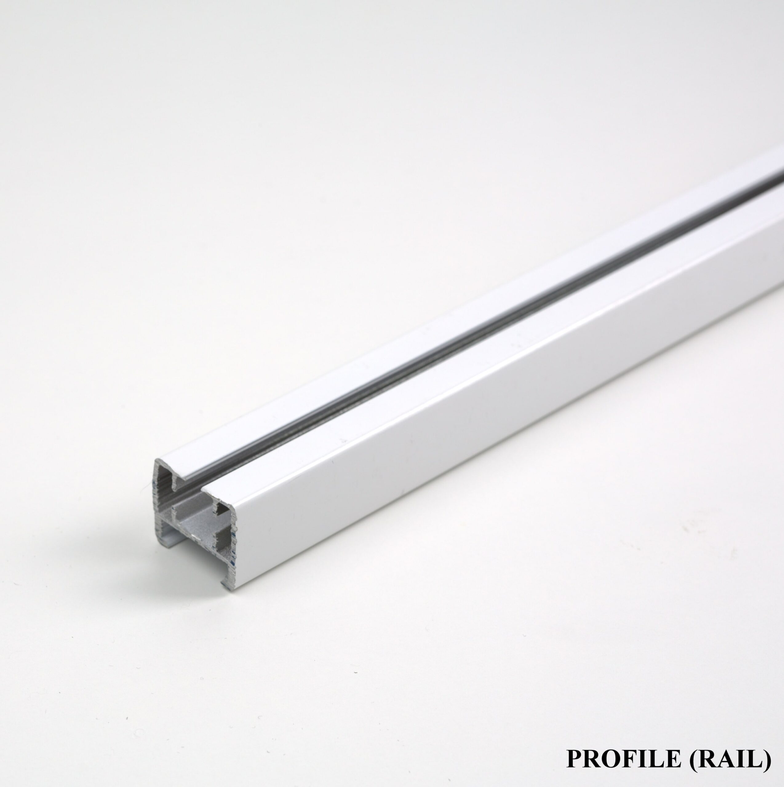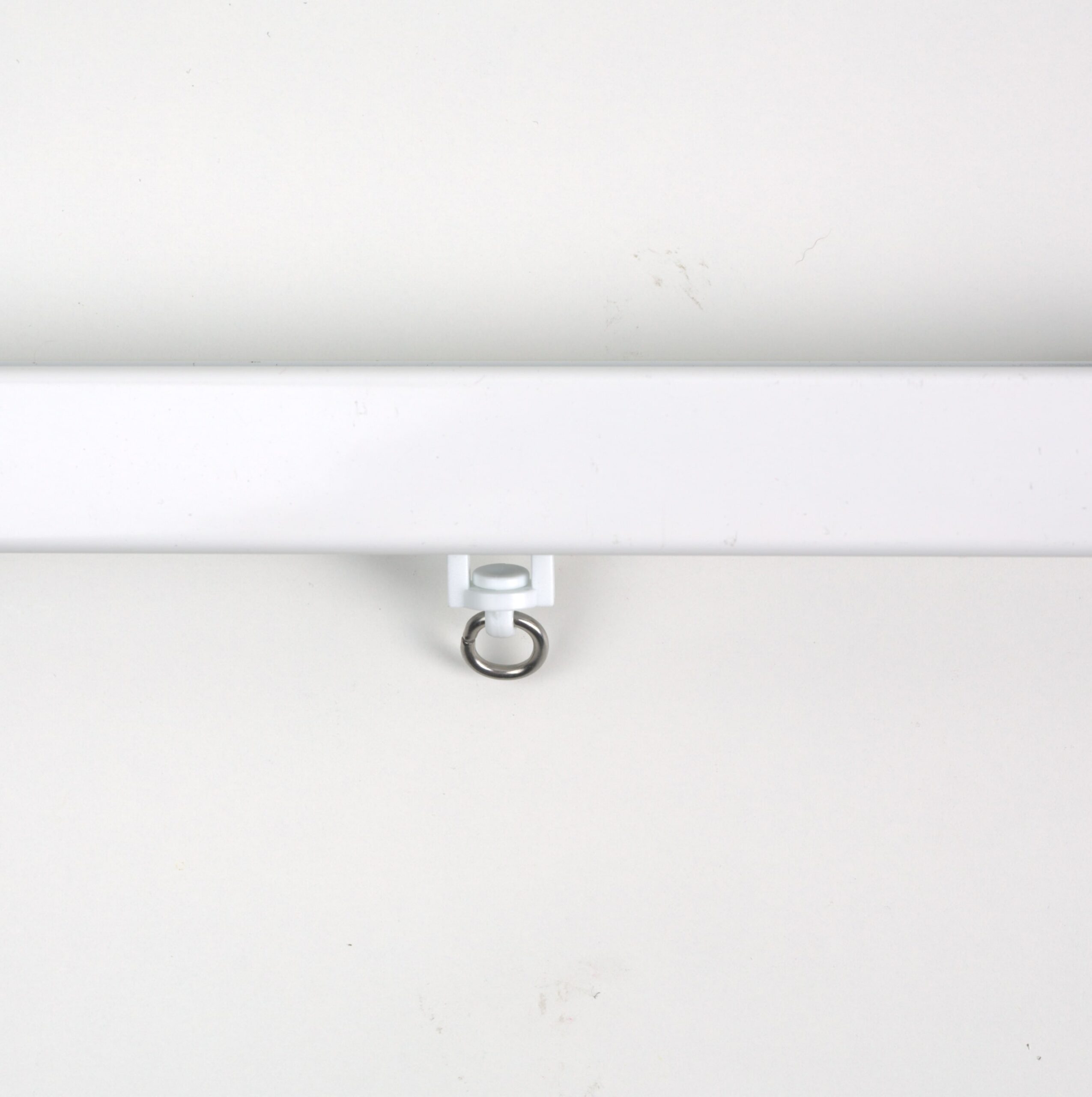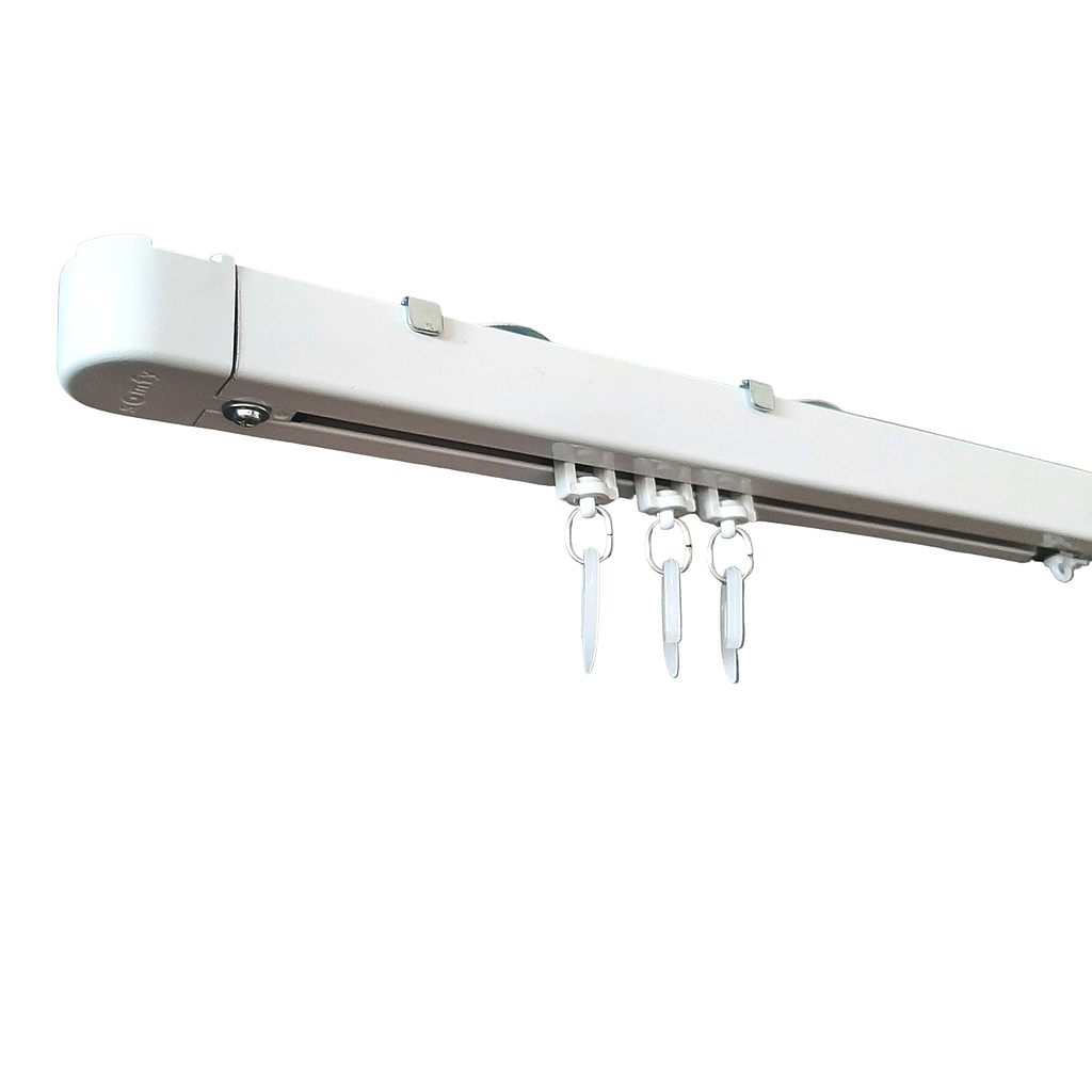 Baltas aliuminio bėgelis su guoliniais ratukais, tinkamas aukštoms luboms.